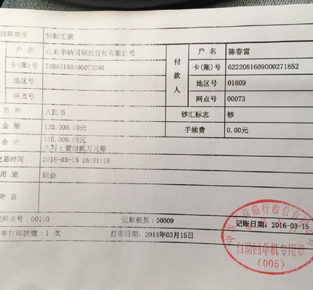 有的消費者還在網上貼出了一張向山東華納國際旅行社有限公司轉賬匯款12萬元的單據。