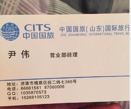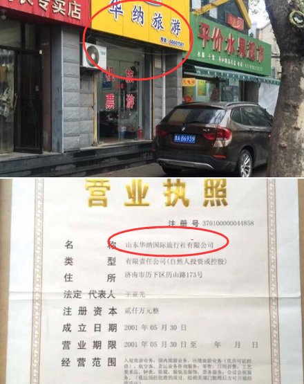 在張欣的微博里,她貼出了帶有疑似中國國旅(山東)國際旅行社有限公司公章的收據等相關證據。另有一張照片顯示為尹偉的名片,上面標注有中國國旅(山東)國際旅行社營業部經理等字樣,另外還有一張照片顯示尹偉疑似擁有名稱為“山東華納國際旅行社有限公司”的營業執照。記者發現,尹偉日常經營的門店也有“華納旅游”字樣的標識。