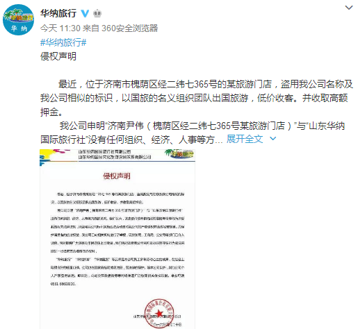 對此,今天上午11點30分,山東華納國際旅行社有限公司通過官方微博回應稱尹偉所為系盜用該公司名稱及相似的標識,與其沒有任何組織、經濟、人事方面的關系。同時,中國國旅(山東)國際旅行社有關工作人員表示,網上貼出的照片中涉及該公司的公章是尹偉假冒的,該公司前幾天在發現尹偉私刻該公司的公章后,已向公安機關報案。