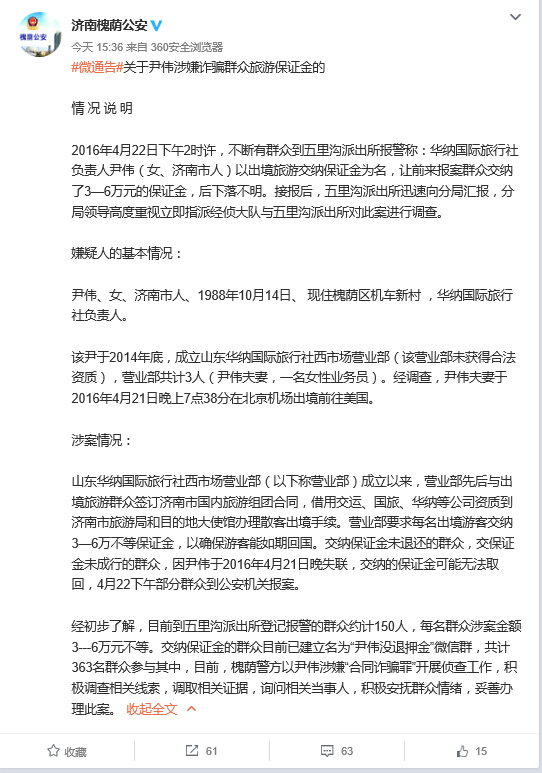 山東華納國際旅行社西市場營業部(以下稱營業部)成立以來,營業部先后與出境旅游群眾簽訂濟南市國內旅游組團合同,借用交運、國旅、華納等公司資質到濟南市旅游局和目的地大使館辦理散客出境手續。營業部要求每名出境游客交納3—6萬不等保證金,以確保游客能如期回國。交納保證金未退還的群眾,交保證金未成行的群眾,因尹偉于2016年4月21日晚失聯,交納的保證金可能無法取回,4月22下午部分群眾到公安機關報案。經初步了解,目前到五里溝派出所登記報警的群眾約計150人,每名群眾涉案金額3---6萬元不等。交納保證金的群眾目前已建立名為“尹偉沒退押金”微信群,共計363名群眾參與其中,目前,槐蔭警方以尹偉涉嫌“合同詐騙罪”開展偵查工作,積極調查相關線索,調取相關證據,詢問相關當事人,積極安撫群眾情緒,妥善辦理此案。