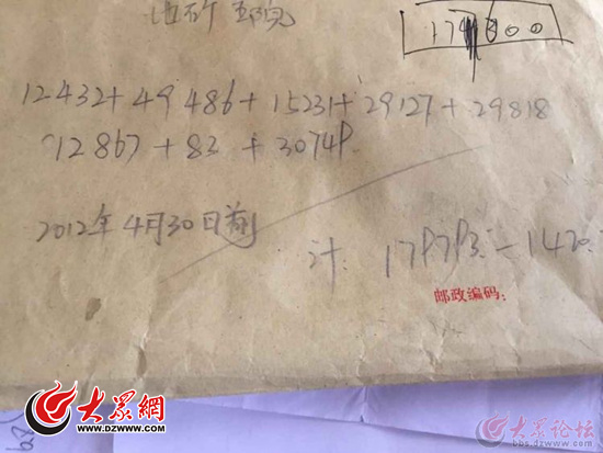 從網友最后發布的一張信封照片上,可以看到,上面有鉛筆寫著的”地礦五院“字樣,并標注出時間為”2012年4月30日前“,總計金額達177000多元。
