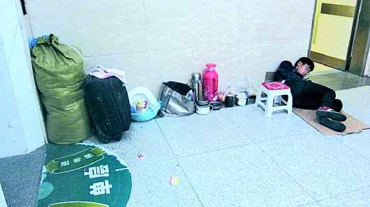 躺在地板瓷磚上的趙延亮正在看書,他告訴記者,一個星期前,正在讀研究生二年級的他向北京的實習單位請了假,趕回來照顧進入重癥監護室的父親。由于睡覺淺,一點聲音都能讓他徹夜無眠,一個星期來幾乎每天晚上都是半睡半醒的狀態。“這時候去計較睡眠環境是件很矯情的事,大家都不容易,能怎么辦?”趙延亮說,也曾經想過給在醫院陪護的母親在附近找個招待所,但一聽一晚就60元的住宿費,母親怎么都不肯。