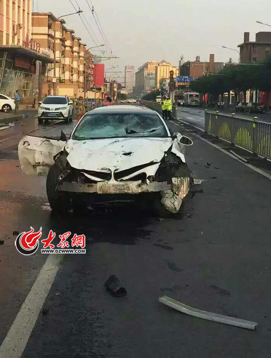 濟南歷下交警大隊民警接警趕到現場發現,肇事的白色寶馬轎車受損嚴重,車內所有的氣囊全部彈出,前后以及兩側都已嚴重變形,保險杠被撞掉,右后輪還插著一根斷裂的護欄,車輛幾近報廢。事發過程中,寶馬車第一次撞斷護欄沖進對向車道后,被撞飛的護欄砸到了正常行駛的一輛中巴車和一輛公交車,兩輛車的駕駛員乘客都被嚇了一跳。