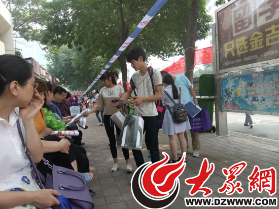 今天上午8點左右,記者在山東師范大學附屬中學考點外發現,有兩名身穿學士服的工作人員正在向考點周圍的家長發放一家房地產公司的廣告。據了解,其中一名工作人員是濟南某高校大一學生,在該房地產公司兼職做宣傳時,她被要求穿著學士服在考點附近發廣告,該工作人員告訴記者,穿著學士服就是為了應個景。無獨有偶,7日上午,濟南的一家婚慶公司在山東省實驗中學考點外面打上了“洞房花燭夜,金榜題名時”的廣告,引來家長和網友的非議。