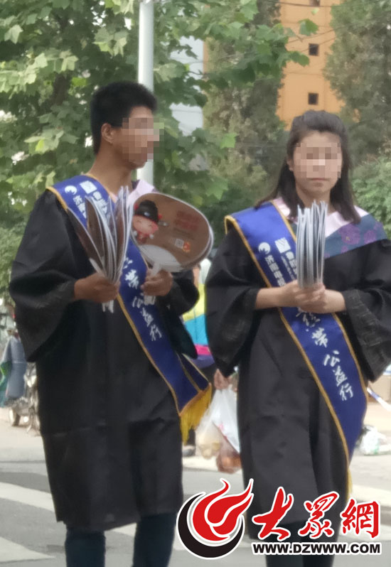 有兩名身穿學士服的工作人員正在向考點周圍的家長發放一家房地產公司的廣告。