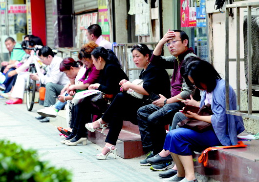 中考首日,15中考點(diǎn)附近,陪考的家長(zhǎng)在考場(chǎng)外等待。本報(bào)記者 高緒亮 攝