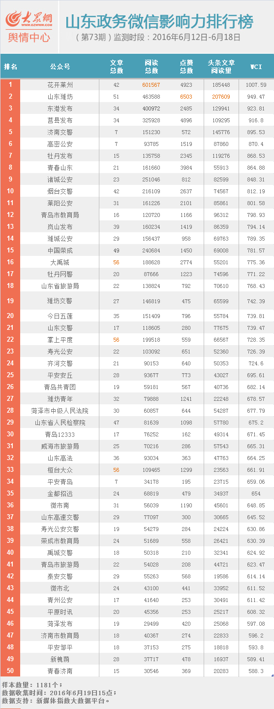 大眾網通過對山東省區縣級以上的政務微信進行數據統計,每周發布山東政務微信影響力排行榜。依據WCI(微信傳播指數)得分情況,每期推出我省政務微信前50強以及一周閱讀量最高的前10篇文章。