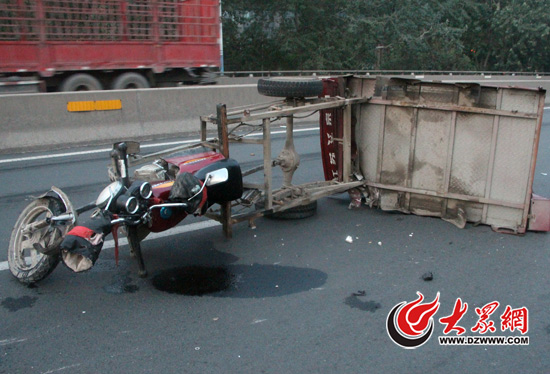 販魚的三輪車側翻,車上雜物散落一地。