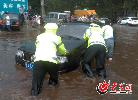 昨晚暴雨濟南數(shù)十輛車拋錨,交警提醒駕駛員積水淹沒排氣管時最好不要涉水通過