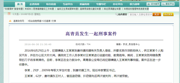 6月29日上午,犯罪嫌疑人王某某到唐坊鎮(zhèn)找鎮(zhèn)有關(guān)負(fù)責(zé)人借錢,并要求其作貸款擔(dān)保人,供王某某個(gè)人購(gòu)買汽車,并在辦公區(qū)大吵大鬧。鎮(zhèn)政府工作人員李某對(duì)王某某進(jìn)行說(shuō)服勸阻、教育疏導(dǎo)。期間,王某某突然用隨身攜帶的刀子將李某捅傷。目前,李某正在全力救治中。高青縣公安局已將犯罪嫌疑人王某某刑事拘留。案件正在進(jìn)一步偵查中。