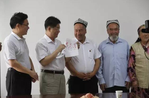 2016年8月2日早,喀什地區(qū)疏勒縣塔孜洪鄉(xiāng)喀拉扎克村的黨支部書記艾素普·艾買提,老黨員代表伊斯馬伊力·阿吾提,海仁莎·艾買提,貧困戶代表麥麥提依明·阿不都熱依木等一行4人,在駐村工作組組長、地區(qū)文體局馬紅科長帶領(lǐng)下,身穿節(jié)日盛裝,帶著全村33名黨員親自寫的感謝信,來到山東援疆指揮部,感謝山東親人免費(fèi)給他們送去的電視機(jī)。山東援疆指揮部總指揮劉曉江、副總指揮部秦存華親自接見了村民代表,并與他們親切交流,敘說山東援疆工作,了解村莊變化和精準(zhǔn)扶貧政策落實(shí)情況,共話美好未來。