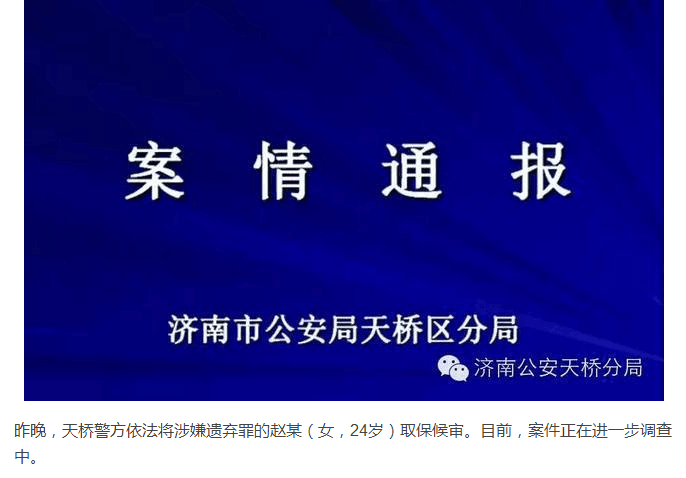 大眾網濟南8月13日訊 近日,大眾網連續報道《誰把剛出生的女嬰扔進了糞坑?濟南警方介入調查》、《追蹤:濟南公廁被棄女嬰母親找到了孩子仍在醫院治療》。目前,該案件又有了新的進展。記者今天從濟南市天橋警方了解到,昨晚,天橋警方依法將涉嫌遺棄罪的趙某(女,24歲)取保候審。