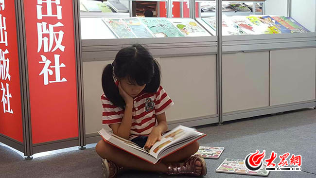 一位臺(tái)灣小朋友在山東展館席地而坐,認(rèn)真閱讀展覽圖書。