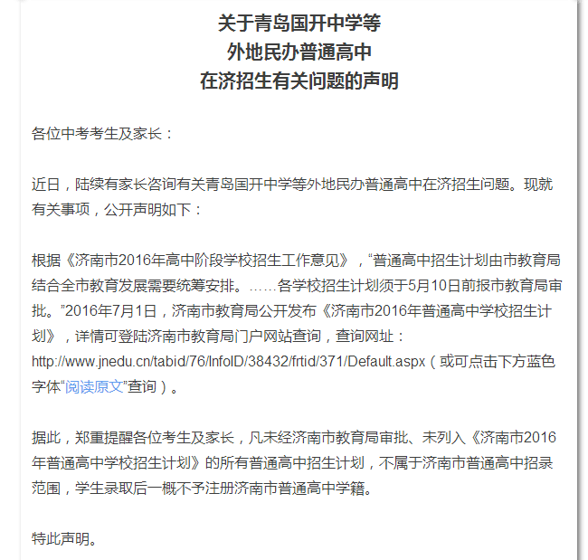 《聲明》還提醒考生及家長,凡未經濟南市教育局審批、未列入《濟南市2016年普通高中學校招生計劃》的所有普通高中招生計劃,不屬于濟南市普通高中招錄范圍,學生錄取后一概不予注冊濟南市普通高中學籍。