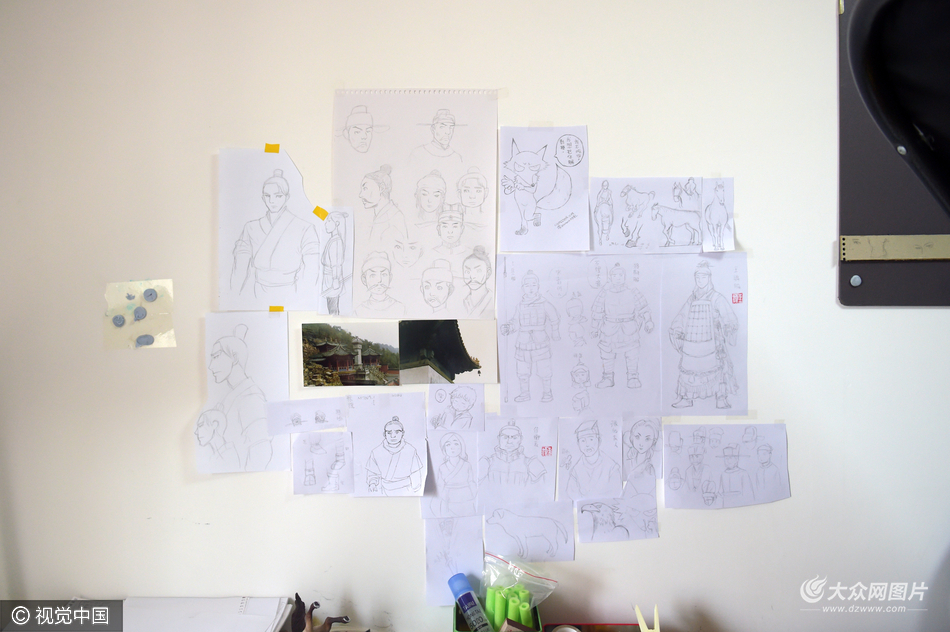 于小博的工作室,墻上貼著的、桌上擺著的,都是她漫畫里各種人物設(shè)計(jì)圖。