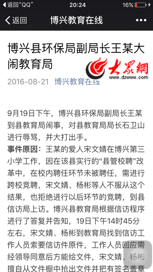 22日,博興縣教育局工作人員向大眾網記者介紹,此事的直接原因是博興縣環保局副局長王祖學的妻子,在“縣管校聘”管理改革試點中,未被聘任。王祖學及其妻子表示不滿,并大鬧縣教育局。