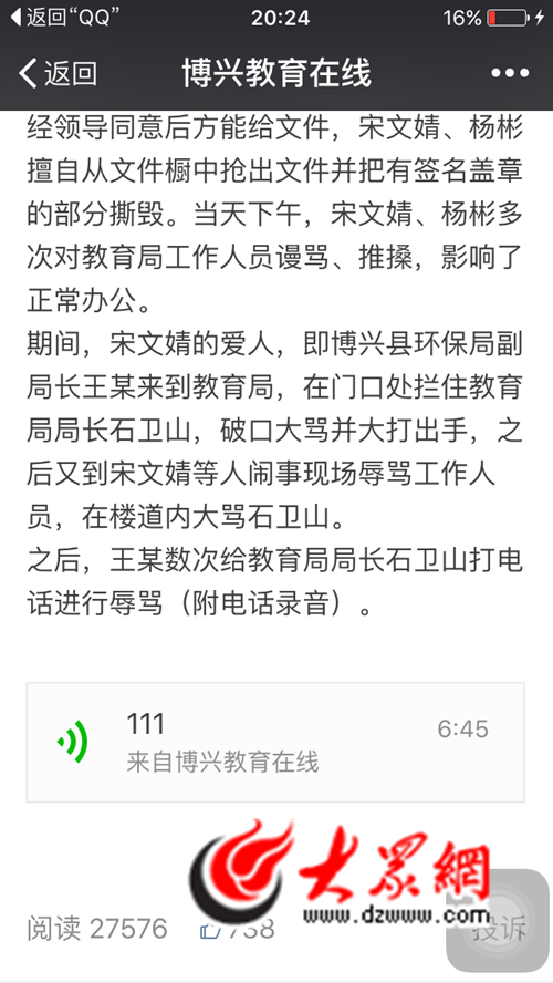 博興縣教育局工作人員對大眾網記者說,王祖學大鬧教育局之后,又打電話給石衛山,在電話里對石衛山進行了長達幾分鐘的辱罵。對此,石衛山進行了錄音,并公布在“博興教育在線”上。
