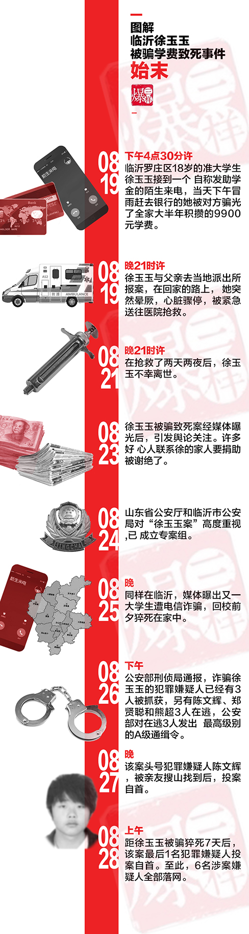 8月28日上午,距徐玉玉猝死7天后,該案最后1名犯罪嫌疑人鄭賢聰投案自首。至此,6名涉案嫌疑人全部落網。