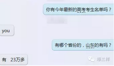 大眾網記者隨意添加了幾個販賣學生數據的QQ號,一個簡介里寫著“2016年最新考生名單”的賣家說,他手上有20多萬山東高考考生的信息,全是今年最新的。信息里包含了學校、姓名、電話、家庭住址、家長電話,能夠保證90%都是有效信息。對方稱,所有山東的數據一起打包買最合算,只要6000元,如果分開買就會貴一點。