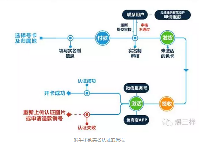 在淘寶網購買手機卡時,除要上傳身份證正反面的照片,還要由本人持身份證拍一張合影上傳;在京東網,購買手機卡必須填寫機主真實姓名和身份證號,在簽收時必須持機主身份證并由派送員拍照留存;在虛擬運營商“蝸牛移動”的官網上,詳細列出了實名認證的流程:在發貨前要進行實名制審核,發貨后激活卡片時還要再進行一次認證。