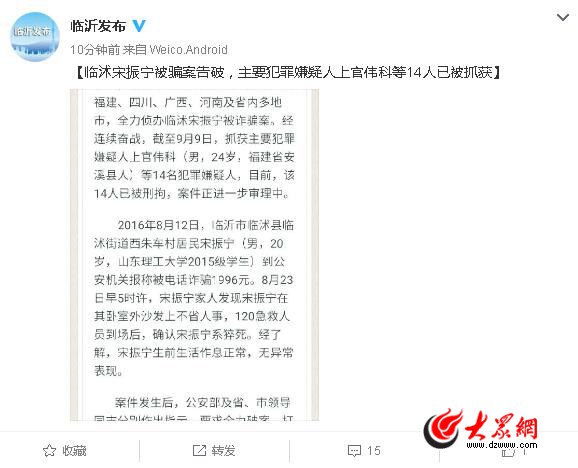 大眾網9月9日訊 記者從山東省臨沂市人民政府新聞辦公室官方微博獲悉,在公安部、山東省公安廳的統一組織指揮和有關省、市公安機關的支持配合下,臨沂市、縣公安機關專案組分赴福建、四川、廣西、河南及省內多地市,全力偵辦臨沭宋振寧被詐騙案。經連續奮戰,截至9月9日,抓獲主要犯罪嫌疑人上官偉科(男,24歲,福建省安溪縣人)等14名犯罪嫌疑人,目前,該14人已被刑拘,案件正進一步審理中。