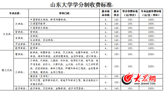 山大學分制收費標準