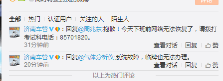 據濟南市車管所官微回應,今天下班前網絡無法恢復。