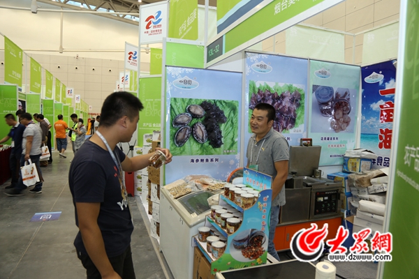 山東煙臺的昊菲食品有限公司的孫總正在為顧客介紹公司的魷魚產品。