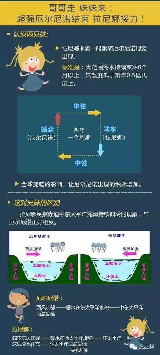 這幾年隨著全球氣候變暖,大家對(duì)“厄爾尼諾”都很熟悉了,但這次可能要來(lái)的“拉尼娜”又是啥呢?樣妹查閱專(zhuān)業(yè)資料發(fā)現(xiàn),拉尼娜是西班牙語(yǔ)“La Ni?a”——“小女孩,圣女”的意思,它是指赤道附近東太平洋水溫反常下降的一種現(xiàn)象,表現(xiàn)為東太平洋明顯變冷,對(duì)區(qū)域或全球一半以上地區(qū)的氣候有顯著的影響。她是厄爾尼諾現(xiàn)象的反相,兄妹倆通常交替出現(xiàn),一個(gè)是“暖事件”,一個(gè)是“冷事件”。