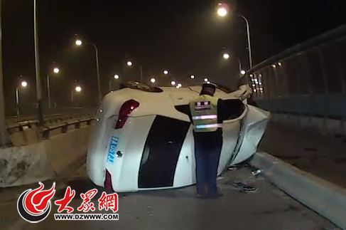 今天凌晨4點左右,濟南天橋交警接到報警稱緯六路高架橋堤口路匝道處發生一起小轎車翻車事故。交警到場發現車上沒有人,在下橋匝道的分流夾角處有撞擊的明顯痕跡。這輛白色轎車受損嚴重,車頭已經面目全非,車輛周圍散落著大量碎片,安全氣囊也全部彈了出來。