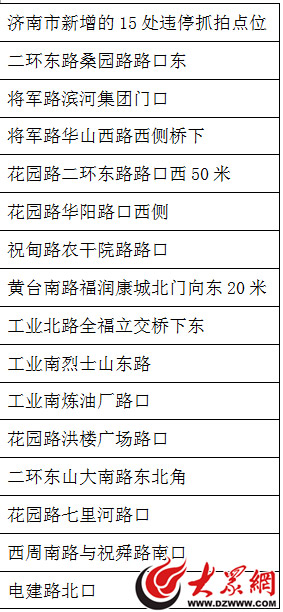 這次新增的15處違法停車抓拍點位全部位于歷城區,分別是:二環東路桑園路路口東、將軍路濱河集團門口、將軍路華山西路西側橋下、花園路二環東路路口西50米、花園路華陽路口西側、祝甸路農干院路路口、黃臺南路福潤康城北門向東20米、工業北路全福立交橋下東、工業南烈士山東路、工業南煉油廠路口、花園路洪樓廣場路口、二環東山大南路東北角、花園路七里河路口、西周南路與祝舜路南口、電建路北口。