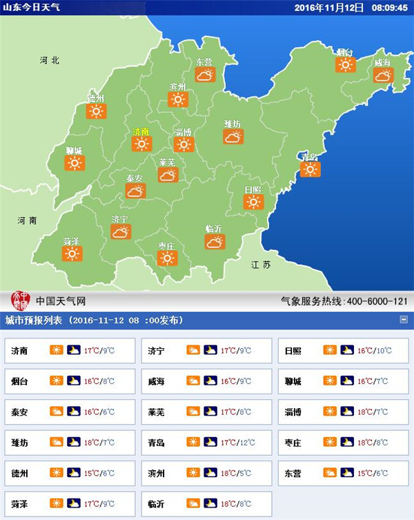 11日晴,南風2~3級增強到3~4級陣風6級,最低氣溫濟陽、商河1℃,有霜凍,市區及其它縣(市)區3~5℃,最高氣溫18℃左右。12日晴,南風短時北風3級左右,最低氣溫濟陽、商河4℃左右,有輕霜凍,市區及其它縣(市)區7~9℃,最高氣溫16℃左右。[詳細]