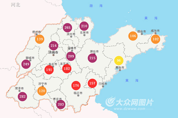截至13日上午11:00,山東17市空氣質量整體“飄紅”,已有濟南、濱州、東營、聊城、淄博、濰坊、棗莊、菏澤8個市空氣質量達到重度污染,其中菏澤污染最嚴重,AQI指數達到282;泰安、萊蕪、臨沂、日照4市中度污染;一向表現優異的威海、煙臺也雙雙“淪陷”,與德州、濟寧一起達到輕度污染;17市中,僅青島仍在“堅守”,空氣質量為良好,AQI指數達到96。