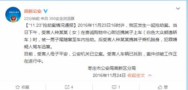 大眾網棗莊11月24日訊 今天上午記者從棗莊市公安局高新區(qū)分局采訪了解到,2016年11月23日16時許,棗莊市高新區(qū)發(fā)生一起搶劫案。當日下午,受害人種某某(女)在貴誠購物中心附近攜其子上車(白色大眾朗逸轎車)時,被一男子尾隨竄至車內搶劫。后受害人種某某攜其子乘機脫身,犯罪嫌疑人駕車逃竄。目前受害人母子平安,公安機關已立案,受害人車輛已找到,案件偵破工作正在進行中。