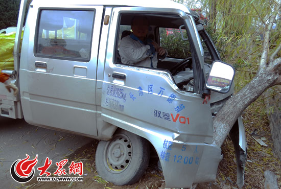 貨車撞在路邊書上,駕駛室嚴重變形。