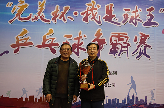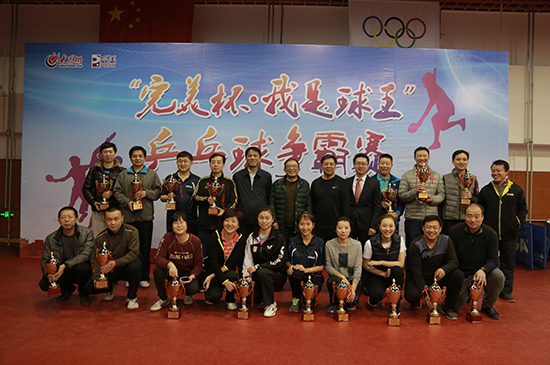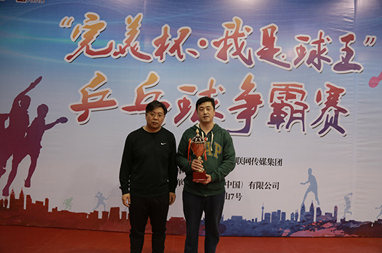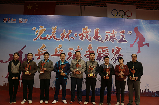 大眾網濟南11月27日訊(記者 劉小芳)今天下午,由山東省互聯網傳媒集團主辦的2016“完美杯·我是球王”乒乓球爭霸賽在山東省體育局訓練中心文東訓練基地落幕。省支付清算協會代表隊奪得冠軍。大眾報業集團監事會主席張軍,大眾報業集團戰略運營部主任、山東文化產權交易所董事長曲濤,山東省互聯網傳媒集團大眾網副總經理陳月軍分別為奪得冠、亞、季軍的單位頒獎。
