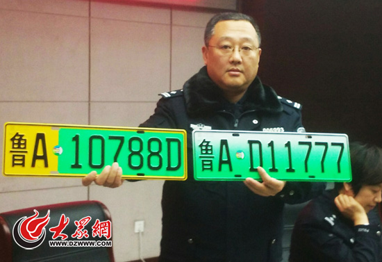 濟南市車管所副所長于奕展示新能源汽車樣牌