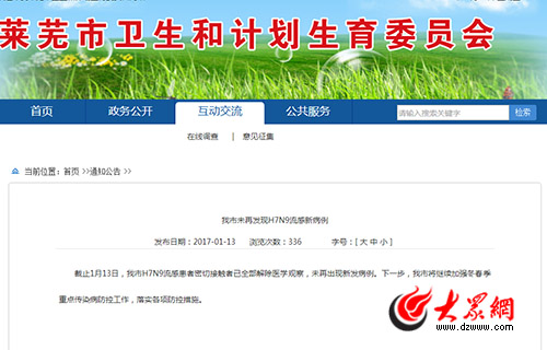 萊蕪市衛計委通報H7N9流感病例情況。