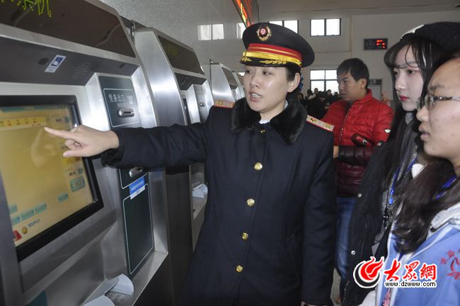 19日下午,煙臺南站客運主任李好先是手把手教給五名青年志愿者,如何幫助旅客使用自動取票機。接著又回到候車室引導旅客檢票,去安檢處幫著一起看安檢儀。列車來了,她又冒著風雪到站臺上維持秩序,直到旅客全部安全上車,看看列車駛出站臺,她才回到屋內。