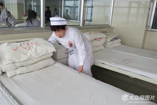 精神科的工作很瑣碎,除了要為患者提供醫療服務外,還要照顧患者的生活。護士長李清華在幫助患者整理床鋪后,推著掃床車,將洗衣房清洗干凈的被服送到倉庫分類放置。