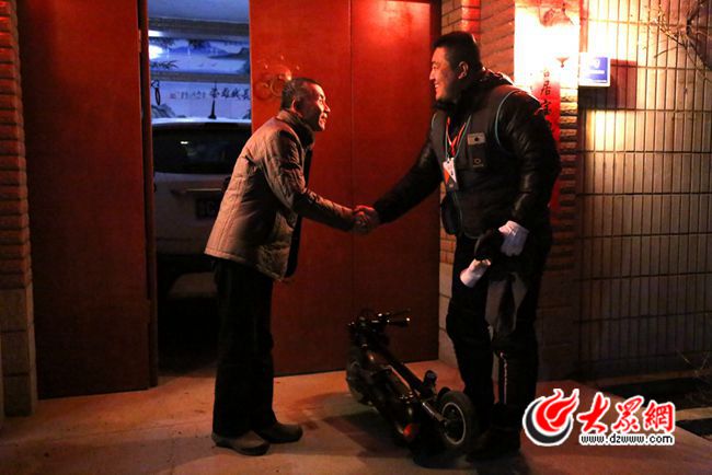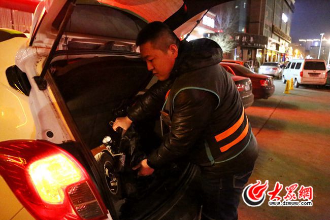 “您好,先生,我是您預定的代駕司機,很高興為您服務。”晚上8點10分,一波客人從酒店走出,李新與同事分頭接到了自己的客人。李新上前一步,將客人的車鑰匙接過來,打開后備箱,鋪好防塵布,將電動車放在了后備箱。征求客人的同意后,大眾網記者也跟隨李新上了車。一路上,李新開車十分平穩,客人云先生也打開了話匣子,跟李新聊起今晚的聚會。6公里的路程,20分鐘,李新把客人送到了家門口,幫客人停好車后,第一單順利結束了。“小伙子車開得很不錯。”臨別時,云先生握著李新的手說。
