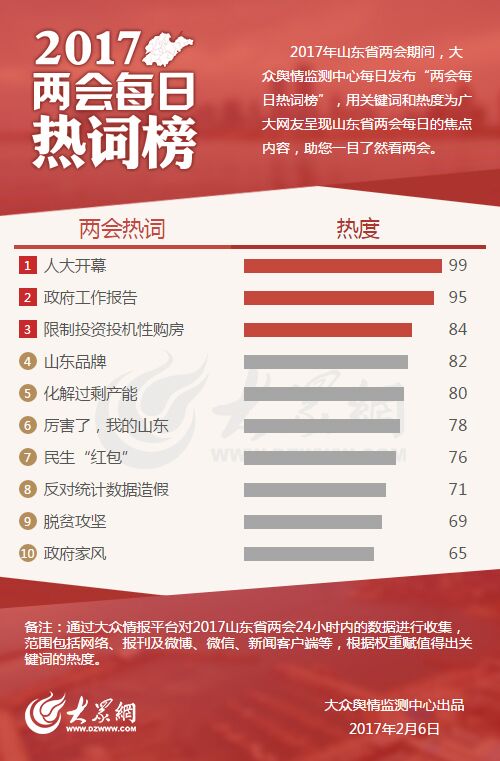 大眾網(wǎng)2月6日訊 今天,山東省十二屆人大六次會(huì)議開幕。大眾輿情監(jiān)測(cè)中心發(fā)布的第二期熱詞榜中,“人大開幕”、“政府工作報(bào)告”“限制投資投機(jī)性購房”分別以99、95和84的熱度位居前三。