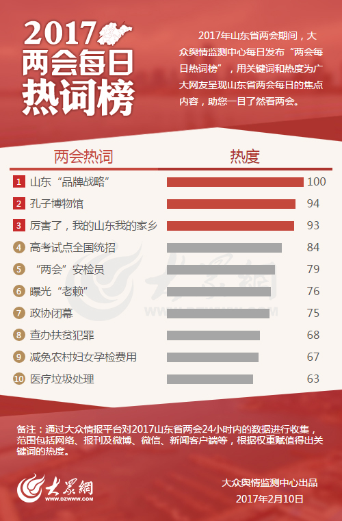 大眾網濟南2月10日訊 今天,大眾輿情監測中心發布第六期“兩會每日熱詞榜”。“山東‘品牌戰略’”“孔子博物館”和“厲害了,我的山東我的家鄉”分別以100、94、93的熱度位列熱詞榜的前三名。