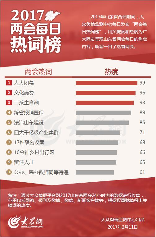 大眾網濟南2月11日訊 今天,大眾輿情監測中心發布第七期“兩會每日熱詞榜”。“人大閉幕”“文化消費”和“二孩生育潮”分別以99、96、93的熱度位列熱詞榜的前三名。