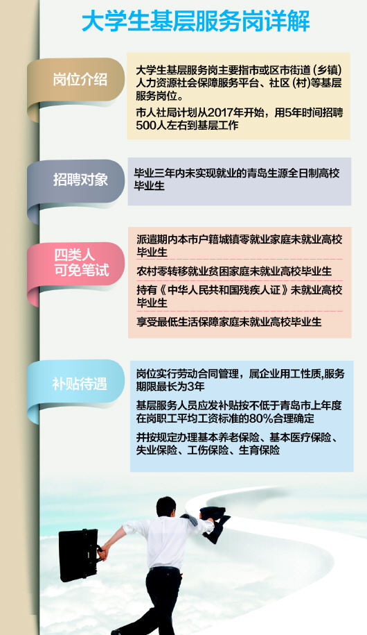 15日,據市人社局高校畢業生就業處處長姜雪梅介紹,為進一步拓寬高校畢業生基層就業渠道,加強基層人才隊伍建設、推動基層事業發展,市人社局于日前出臺了《關于開發大學生基層公共管理和社會服務崗位吸納高校畢業生就業有關問題的通知》(以下簡稱“通知”),計劃從2017年開始,用5年時間,招聘一定數量的高校畢業生安排到基層服務崗位從事公共管理和社會服務工作。大學生基層服務崗位主要指市或區市街道(鄉鎮)人力資源社會保障服務平臺、社區(村)等基層服務崗位。