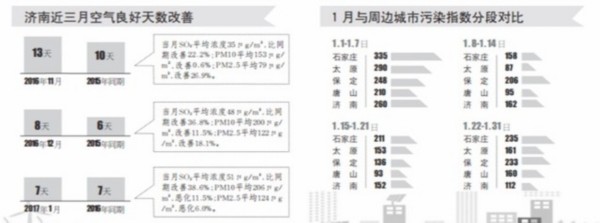 此外,濟南市還進行了清潔型煤的推廣,集中開展散煤整治,接近30萬戶居民實現生活燃煤清潔化。在2月16日的全省環境保護電視電話會議上,副省長張務鋒介紹,根據監測數據,凡是煤炭清潔高效利用工作進展快的城市,空氣質量改善幅度就大,特別是濟南、淄博、濟寧、德州、聊城等市,改善幅度居全省前列。