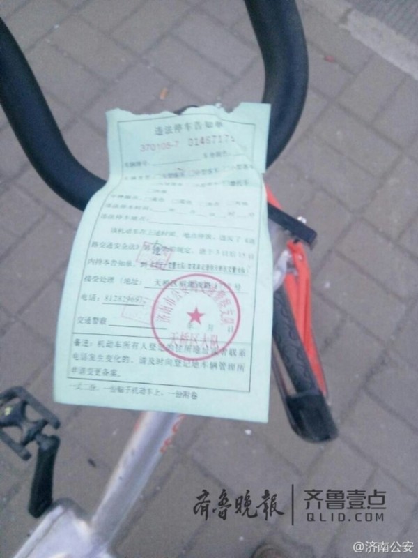 記者注意到,單從流傳的兩張照片上并不能判斷單車停放的時間、地點,從圖片上只能看到濟南市公安局交通警察支隊天橋區大隊的紅印,其他的如貼單民警,違停車輛牌照、時間、地點等均無法看清,乍一看像是一張空白的違停處罰通知單。