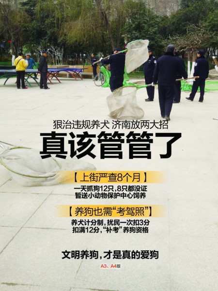 春季來臨,違規養犬、犬只擾民、流浪犬傷人等問題開始突出,為保證市民人身健康、大幅減少涉犬舉報投訴,濟南市公安局決定進行違規養犬整治專項行動。這次行動,由各分局治安大隊、中隊,專管民警、稽查隊員以及山東省泰山小動物保護中心的志愿者參加。