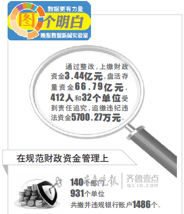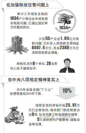 審計(jì)報(bào)告中提及,截至2017年2月底,審計(jì)工作報(bào)告反映的36類77項(xiàng)問題,67項(xiàng)已全部完成整改,其余10項(xiàng)正積極推進(jìn)(已完成81%)。通過整改,上繳財(cái)政資金3.44億元,盤活存量資金66.79億元,412人和32個單位受到責(zé)任追究,追繳違紀(jì)違法資金5700.27萬元。另外,審計(jì)工作報(bào)告反映的119名省管領(lǐng)導(dǎo)干部經(jīng)濟(jì)責(zé)任審計(jì)查出的問題已基本完成整改。