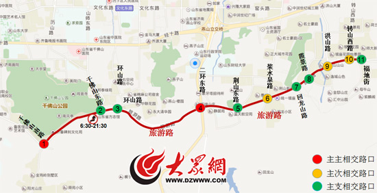 濟(jì)南交警支隊公布的交通管理方案顯示,2017年4月28日(周五)起每個工作日的早高峰(7:00-9:00),對旅游路沿線的千佛山東路、荊山東路、漿水泉路、霞景路、福地街路口東西向采取禁止左轉(zhuǎn)措施。在此之前,千佛山東路路口的西口已經(jīng)實(shí)行早6:30到晚21:30限時禁止左轉(zhuǎn)。